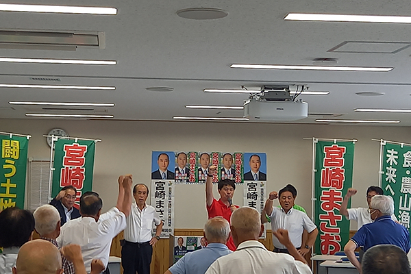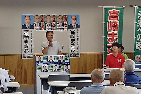 7月11日、午後1時から都田事務所、午後2時半からは浜北文化センター内で、候補は不在ではありましたが宮崎まさお候補の関係者と、それぞれの地区の土地改良区の関係者と農業関係者が集まり会合をもち、開催の冒頭、私もご挨拶させて頂きました。