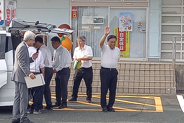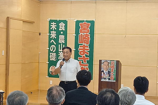 7月15日、初南コミュニティホールで開催された演説会に三ヶ日街頭演説直後にかけつけ、お集まりの皆様にご支援のお願いをさせて頂きました。又、こちらの会場でも後援会副会長が本人に成り代わりお集まりの皆様にご支援下さる様にとお願いがありました。