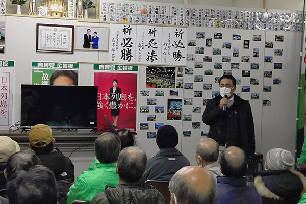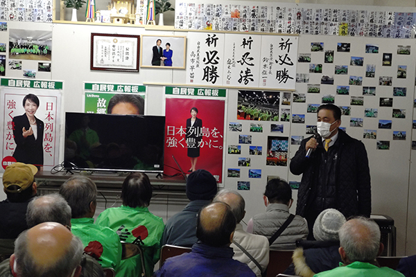 2月4日、三方原の事務所で開催された応援演説会。全国各地を訪れ、同志の応援演説に立っている候補に代わって第七選挙区の県議・市議が演説を行いました。夜7時半からの集会にも関わらず、近隣の方々が沢山駆けつけて下さいました。初めに第七選挙区支部の幹事長として皆さまにご挨拶させて頂きました。次に市議から応援の演説等を行いました。