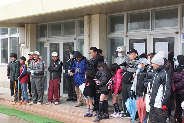 2月8日、初生小学校にて開催されるグラウンドゴルフ大会にてご挨拶させていただく予定でしたが、雨天により注視となりましたが、早朝より集ってこられた方々とお話しさせていただきました。