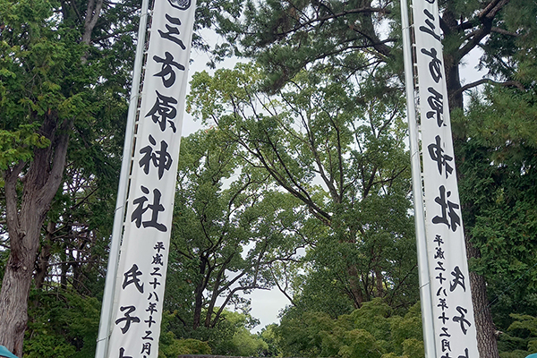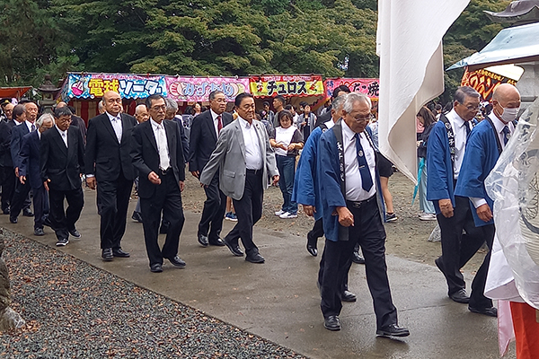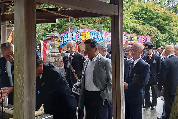 10月12日、午後3時からの祭事(神事)に参列。境内には祭事終了後の餅投げを待っている方々もたくさん集まっており氏子の皆様と一緒に餅投げをさせて頂きました。