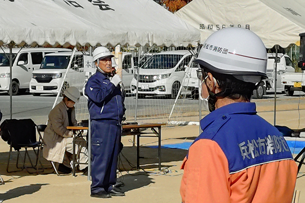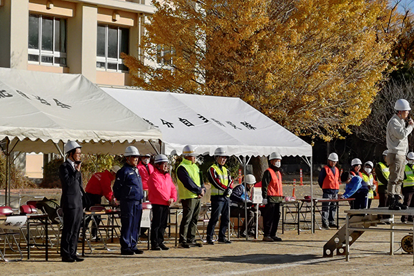 12月7日、浜松市立初生小学校のグラウンドにて朝9時から始まった合同防災訓練。参加者は6自治会の防災隊員、中学生、高校生、一般の方、そして市消防局中消防署曳馬野出張所や消防団の第29分団の皆さんの協力のもと、合同訓練が行われました。