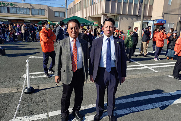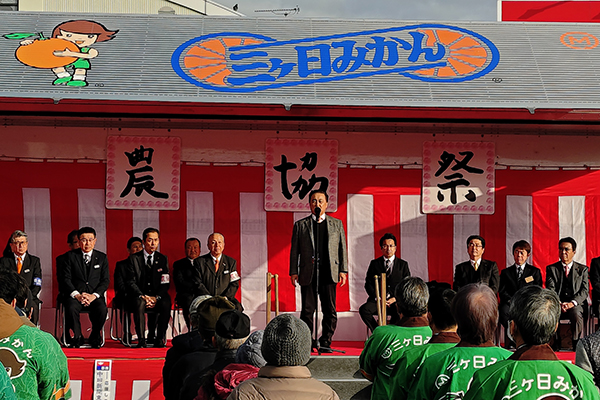 1月10日、朝8時半から三ヶ日農協本館前広場(駐車場)で開催された、「第43回農協祭」にお招き頂き、伺いました。今年のテーマ「農業と地域の未来をつむぐ”協同の和”」の下、会場には早朝にもかかわらず、多くのお客様が訪れており、新鮮な野菜を買い求めたり、みかん運びゲームやキッチンカーやマルシェコーナーでの飲食など様々な催しが行われ大変賑わっておりました。