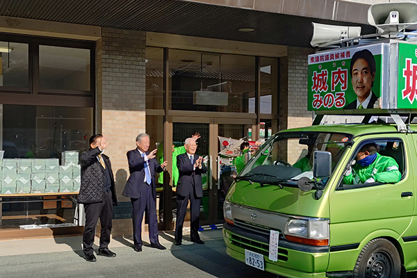 1月27日、本日衆議院選挙が公示されました。城内みのる候補の陣営といたしまして、第七選挙区の県議・市議・事務所スタッフとわずかな関係者で選挙中の無事故を祈願し、街宣車を拍手で送り出しました。投票日は2月8日、即日開票となります。