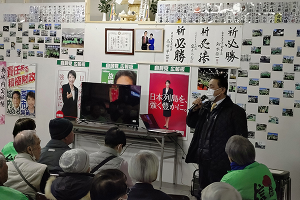 2月4日、三方原の事務所で開催された応援演説会。全国各地を訪れ、同志の応援演説に立っている候補に代わって第七選挙区の県議・市議が演説を行いました。夜7時半からの集会にも関わらず、近隣の方々が沢山駆けつけて下さいました。初めに第七選挙区支部の幹事長として皆さまにご挨拶させて頂きました。次に市議から応援の演説等を行いました。